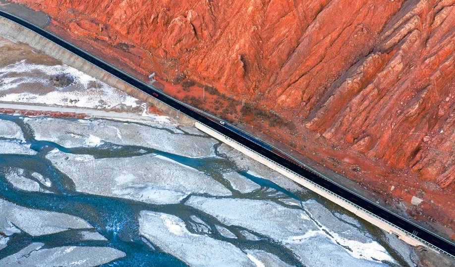 这是一幅高空视角下的峡谷图景,赤红的丹霞岩壁如被烈火灼烧过的幕布,层叠的纹理在阳光里泛着热烈的光泽。一条黑色公路如利刃般劈开峡谷,沿着崖壁边缘延伸,与下方冰河蓝白交织的纹理形成强烈的视觉冲击。冰裂的河道如凝固的蓝玉,在浅灰的滩涂上勾勒出细密的脉络,残雪与融水为冷峻的地貌添了几分灵动。作品以浓烈的色彩对比,展现出高原峡谷的雄浑与冰河的细腻,在自然的壮阔里,藏着人类行路的痕迹。
