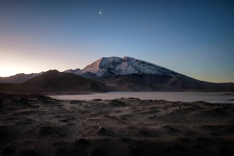 这是帕米尔高原上的静谧时刻,慕士塔格峰的雪顶在渐变的天色里泛着冷冽的光,山脚下的卡拉库里湖如一面凝固的镜子,将雪山的轮廓晕染在冰面之上。低空悬着一弯残月,与天边的晨曦遥相呼应,暖粉与靛蓝的天色在高原的旷野里缓缓过渡。前景的戈壁滩以粗粝的肌理,衬出雪山湖泊的澄澈与壮阔,在这片极致的寂静中,时间仿佛也随冰湖一同凝固,唯有星月与雪峰,见证着高原晨昏交替的温柔与苍茫。