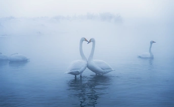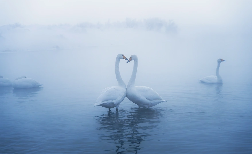 在被晨雾晕染成淡蓝的湖面上,一对天鹅以脖颈交缠出温柔的弧度,宛如沉浸在静谧里的恋人。它们洁白的羽毛在薄雾中泛着绒绒的光,水波轻漾,将倒影揉成细碎的银蓝。远处几只天鹅或静栖、或游弋,在这片朦胧的水色里,时间仿佛也慢了下来。这幅画面以极致的柔和色调,定格了自然生灵间的亲昵瞬间,让诗意与温柔在薄雾里缓缓流淌。