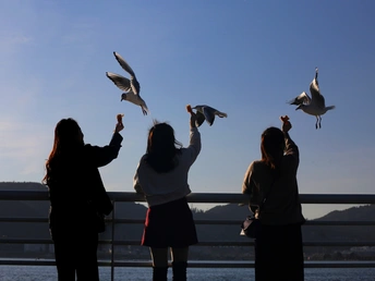 暖冬的午后,滇池的风裹着阳光漫过栏杆。姑娘们高高举起掌心的面包,引得红嘴鸥纷纷俯冲而来,翅膀划破澄澈的蓝天。剪影里的身影被日光镀上金边,远山与水面静静铺展。这是属于海埂大坝的浪漫约定,每一次振翅,都是对人间烟火的温柔回应。