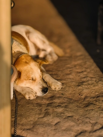 构图以“局部特写”构建沉浸感:睡犬蜷缩于画面左侧,头部枕在前爪上,身体沿斜向延伸至背景,形成自然的视觉引导线。前景的木柱与链条构成框架式构图,将观者视线聚焦于犬的面部——闭合的眼睑、微张的嘴角、松弛的耳廓,细节刻画让“熟睡”的状态极具真实感。背景的暗调与地面的纹理形成层次,留白处仿佛能听见均匀的呼吸声,静态画面生出时间的流动感。 色彩是大地色系的温柔交响:犬毛的棕黄与米白渐变,像被阳光晒暖的稻草,耳尖与背部的深棕点缀其间,增添自然的斑驳感;地面的赭石色与木柱的浅黄呼应,暗部的墨黑则衬托出主体的暖调。侧逆光勾勒出犬毛的绒毛质感,在鼻尖与爪垫形成细碎光斑,让“温暖”有了可触摸的视觉形态。 情感藏在“全然的松弛”里:睡犬毫无防备的姿态,传递出对环境的绝对信任——链条的束缚在此刻失去意义,只剩下肌肉的放松、呼吸的绵长。画面没有激烈的情绪,却在“蜷缩”“垂耳”“轻鼾”的细节中,让人感受到生命最本真的安宁。观者仿佛被邀请进入这场午后小憩,所有焦虑都在犬的睡颜中融化。 主题是“束缚与自由的辩证”:链条象征现实的限制,睡犬的姿态却诠释着精神的自由——即使身处方寸之地,依然能在梦境中奔跑。