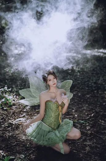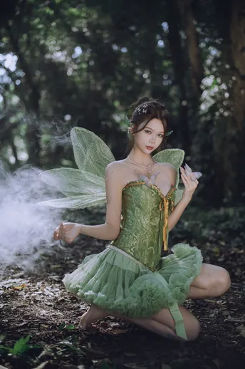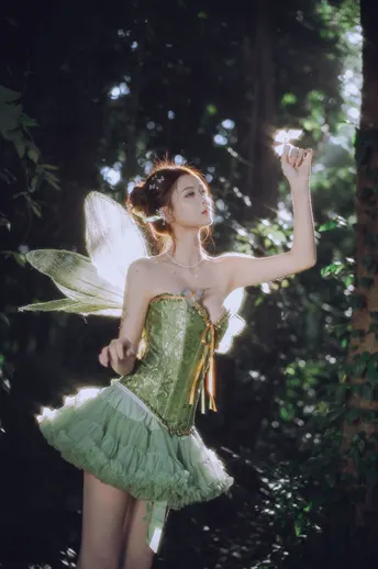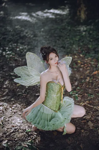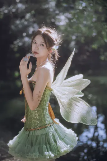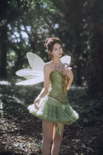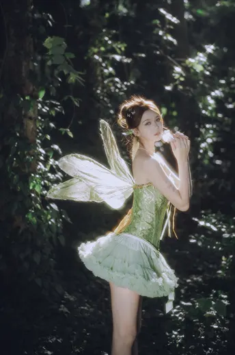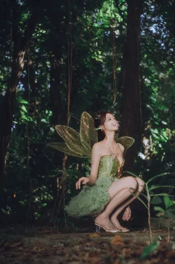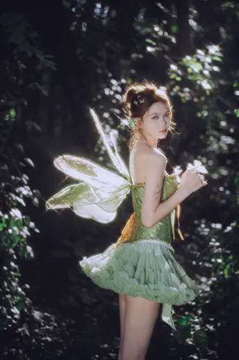 仙女本仙驾到🧚🏻‍♂️ 这片森林是本仙的秘密花园🌸 阳光下的翅膀blingbling发光,每一步都像在撒仙尘✨ 绿色裙摆和树林太配啦,今天就是逃到人间的小精灵