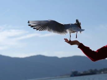 晴空如洗,远山如黛,湖面的风裹挟着清冽气息。一只海鸥翩然降落,红爪轻扣掌心,羽翼在阳光下泛着银白光泽。红衣的手臂舒展着,承接这来自天际的造访,无需言语,便将冬日的灵动与治愈,揉进这一方澄澈天地里。