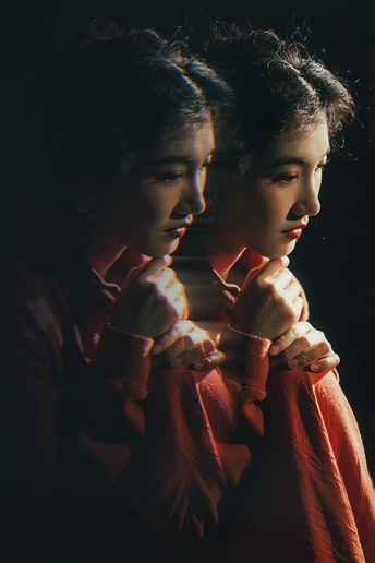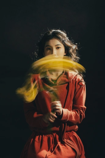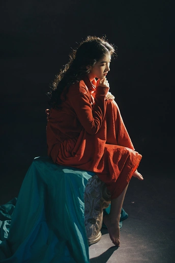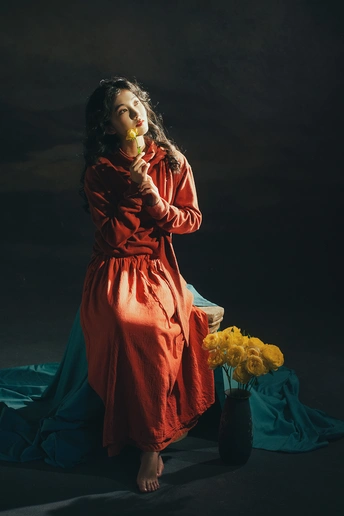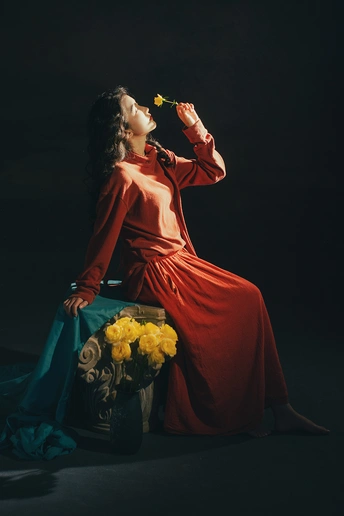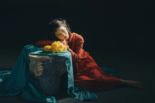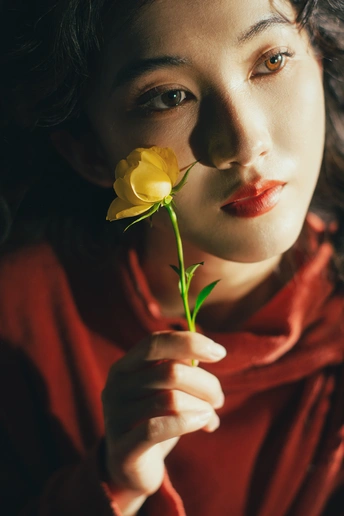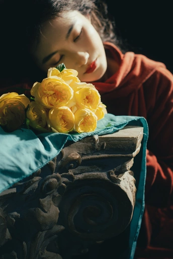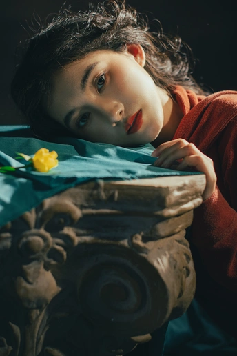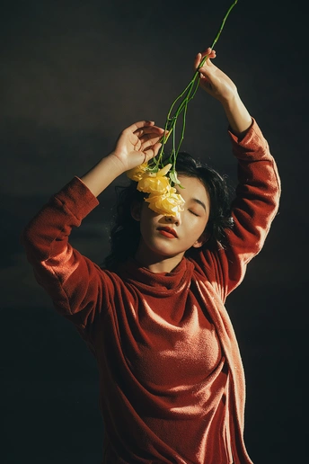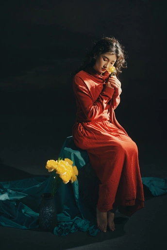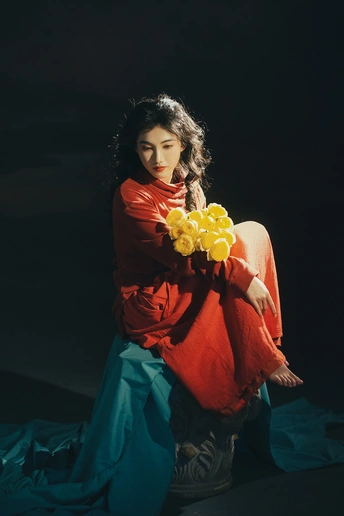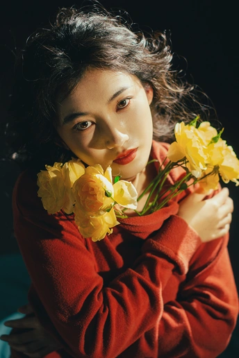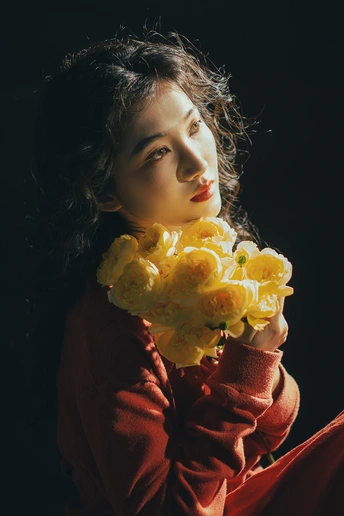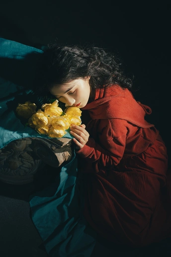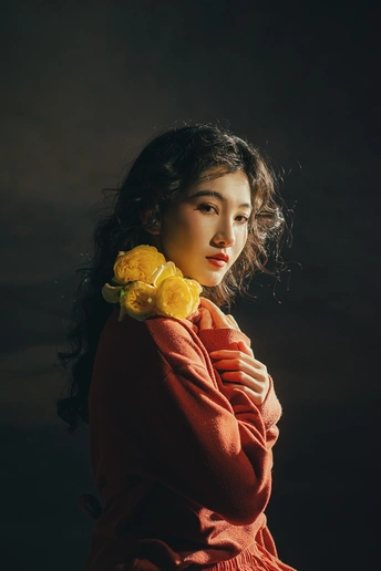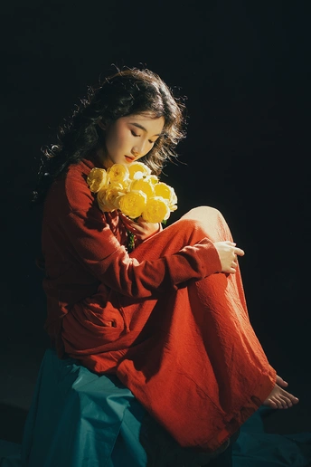 暗房里,光从一侧漫进来,像被时光轻轻吻过。 橘红的衣料裹着体温,明黄的花束在掌心呼吸。 我低头,让花瓣蹭过唇瓣,把喧嚣关在黑幕之外。 原来最治愈的,从来不是奔赴远方,而是在自己的世界里,安静地,做一回主角。 出镜:禾里雪 灯光指导:猫叔日记 妆造:秋如冬