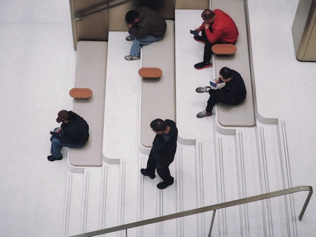 画面中,几人在阶梯式座椅区域活动。有人专注看手机,有人静坐休憩,还有人踱步,简洁的空间里,时光仿佛在此刻慢了下来。