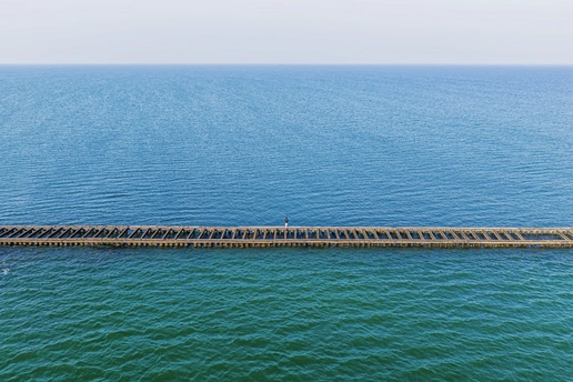 拍摄于东营,长堤横贯海面,以极简几何结构分割天地,人立于堤中,成为宏大自然间的唯一注脚。