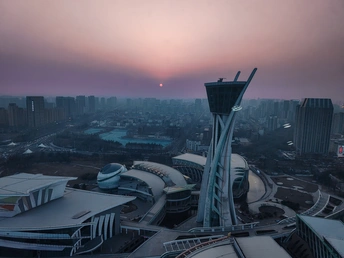 构图以“垂直与水平的交响”构建城市史诗:中央观光塔如银剑刺破天际,螺旋线条与周边建筑群的几何轮廓形成动态对比。远景落日悬于中轴线,地平线分割暖紫天幕与冷灰建筑群,近景圆形穹顶与塔尖锐角构成“圆与方”的平衡,视线从塔尖延伸至落日,完成“人工造物”到“自然馈赠”的空间叙事。 色彩是冷暖交织的调色盘:天幕从浅粉过渡到深紫,落日橘红如宝石嵌于暮色,为冷调建筑镀上暖边。玻璃幕墙反射霞光,金属结构泛着冷银光泽,车流暖黄光点串联城市血脉。色彩对比中,人工理性与自然感性达成和解,呈现“钢铁森林”的温柔时刻。 情感藏在“疏离与归属的共生”里:高楼曾是冰冷符号,此刻被霞光赋予温度。观光塔的孤傲与落日的包容形成张力,让人在宏大叙事中既感受城市陌生感,又因霞光生出“此心安处是吾乡”的归属感——钢筋水泥的森林,也能生长诗意栖居。 主题是“城市文明的昼夜交响”:落日象征自然节律,建筑群代表人类创造,二者在暮色中对话。主题超越“风光”表层,探讨“人与自然共存”:当建筑成为霞光容器,城市便有了呼吸温度,文明在平衡中获得永恒。 艺术价值在于“瞬间的城市肖像”:摄影师捕捉昼夜交替的黄金时刻,将流动霞光与凝固建筑定格。