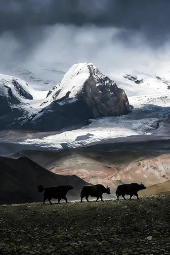 站在去往南疆喀什塔县途中的砾石滩上,风裹着帕米尔高原的凛冽,吻着脸颊,拂过耳畔。抬眼时,慕士塔格峰的雪冠刺破云层,冰川在山坳间铺展成银白的绸带,褐红色的山体与皑皑白雪交错,晕染出高原独有的苍茫肌理。 镜头下,三头牦牛踩着粗粝的地面缓缓前行,它们的身影在天地间凝成厚重的剪影。作为高原的原住民,它们早已习惯了这里的风雪,步履沉稳得如同这片土地的脉搏。我刻意保留了光影的粗粝感,只轻轻提亮牦牛的轮廓,让它们在沉郁的暮色里,成为连接天地的锚点。 塔县的美,从不是精致的雕琢。它是喀喇昆仑山脉的雄奇,是帕米尔高原的辽阔,是牦牛踏过荒原时,蹄声与风声的和鸣。在这里,时间仿佛被雪山拉长,所有的喧嚣都被抛在身后,只剩天地的壮阔与生命的坚韧。 按下快门的瞬间,我忽然懂得,塔县的每一寸风景,都是自然写给人间的史诗。那些沉默的雪山,那些倔强的生命,都在诉说着高原的传奇。这帧画面,不仅是风景的定格,更是我与帕米尔最赤诚的相遇。