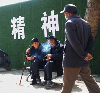 暖阳下的岁月絮语。春日暖阳洒落街头,绿色围挡上“精神”二字静静矗立,成为这幅市井画面的独特注脚。两位老者悠然坐在长椅上,一位手持拐杖,指间青烟袅袅升腾,烟雾晕染出岁月的斑驳;另一位侧耳倾听,眉眼间满是松弛。一旁行人从容走过,不惊扰这份老友相聚的闲适。时光仿佛在此刻慢下来,简单的交谈、温暖的阳光,拼凑出晚年生活最动人的烟火温情,尽显岁月静好的恬淡。