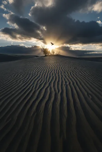 当落日熔金,最后一缕光挣脱云层的怀抱,这片无垠的沙海便奏响了它一日中最磅礴的寂静乐章。光线不再是照亮,而是雕刻——它以最温柔也最锋利的笔触,在沙痕连绵的曲线上,勾勒出一道道深邃而细腻的纹理。那是风与时间合著的诗行,一行行、一阕阕,写满了关于永恒与变迁的辩证。 一只飞鸟的剪影,正奋力划过这片盛大的辉煌。它渺小,却以一往无前的姿态,刺破了光与暗的交界,成为这幅静默画卷中最具生命力的注脚。与之相对的,是地平线上几株枯树的剪影,它们以嶙峋的沉默,锚定了这片流动的风景,像是岁月在此设立的坐标,讲述着另一种坚韧与守望。 此刻,暖调的光芒正缓缓退潮,冷调的暮色悄然浸润天空。云层被染成从淡金到青灰的渐变色,仿佛是天空在为这场每日的告别仪式铺上庄严的幕布。这里,没有喧嚣,只有光影在沙的琴键上缓缓移动,奏响一曲宏大而安宁的宇宙回响。这不仅是沙漠的余晖,更是一场关于存在、孤独与希望的视觉沉思,让观者的心也随之沉静,在苍茫中感受到一种难以言喻的、天地初开般的力量与美。