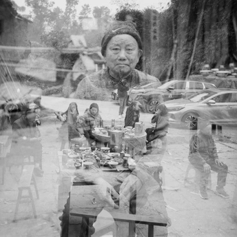 相机:哈苏500cm 胶卷:乐凯400 画面解读 • 核心元素:画面中心是一位面容饱经沧桑的老人,他的肖像与下方的乡村宴席场景相互渗透。宴席上,村民们围坐在摆满菜肴的圆桌旁,背景中还能看到现代汽车与传统的乡村环境。 • 视觉语言:黑白影调强化了画面的厚重感,多重曝光的朦胧质感则模糊了时间与空间的界限,仿佛将老人的一生与这片土地的烟火气、时代变迁融为一体。 • 情感表达:老人沉静的眼神与热闹的宴席形成对比,既展现了个体在集体中的存在感,也隐喻着传统乡土社会在现代化进程中的复杂面貌,充满了对生命、时间与乡土的深刻思考。 创作手法解析 • 多重曝光:这是一种通过在同一张底片上进行多次曝光,将不同影像叠加的摄影技法。在这张作品中,摄影师很可能先拍摄了老人的肖像,再叠加了宴席的场景,通过控制曝光与叠加模式,让两个画面自然融合。