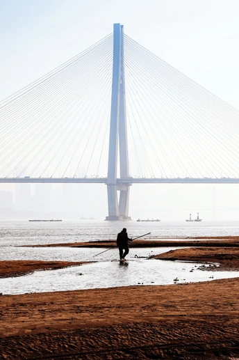 枯水期的长江露出长江浅滩,水坑与沙洲交错吸引来许多玩耍的人,也留下了一些垃圾。一位老人拿着捞杆行走在江水浅滩中,这位长江守卫者的身影与远处的跨江大桥一大一小相互呼应。