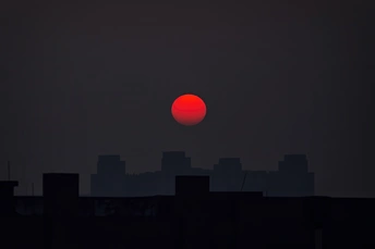 构图以“极简几何”构建视觉冲击:漆黑的城市剪影横亘画面底部,轮廓参差如锯齿,将天空分割为上下两部分。正中央悬着一轮饱满的赤日,圆形的炽烈与建筑的棱角形成“圆与方”的原始对立,地平线被压至画面三分之一处,让红日占据绝对视觉重心,观者目光无法回避这轮“悬于城市之上的审判者”,感受自然伟力对人工文明的无声叩问。 色彩是红与黑的终极对话:深邃的墨黑吞噬了城市细节,只余剪影的冷硬;中央红日从橘红渐变为暗红,边缘晕染出朦胧的光雾,如燃烧的瞳孔凝视大地。单色的极致对比剥离了多余层次,红色成为唯一的情绪出口——既是末日般的警示,又是涅槃重生的隐喻,在压抑的黑底色中,红太阳如心脏般搏动,传递出“毁灭与希望”的双重张力。 情感藏在“敬畏与渺小的交织”里:巨大的红日悬于城市上空,建筑在其光芒下沦为卑微的剪影,让人想起人类面对自然时的无力感。画面没有喧嚣,只有沉默的对峙——当落日将天空烧成熔金,当城市在暮色中低头,观者会生出对天地的敬畏,对自身存在的思考,在宏大与渺小的落差中,感受宇宙的苍凉与壮美。 主题是“自然神性与人类文明的角力”:红日象征原始自然的不可战胜,城市剪影代表人类对空间的征服。