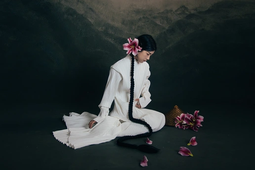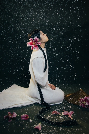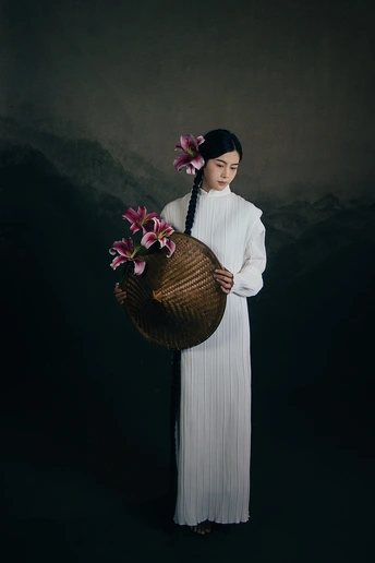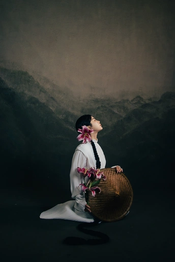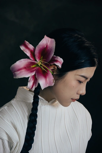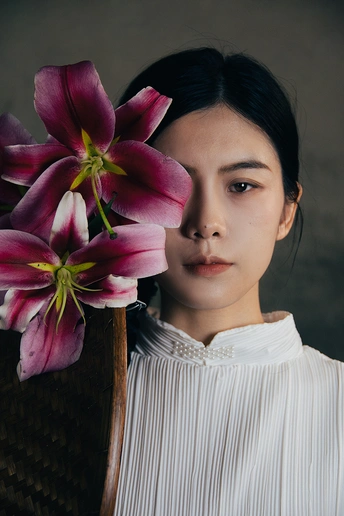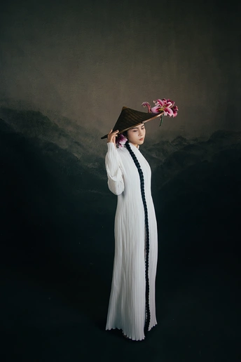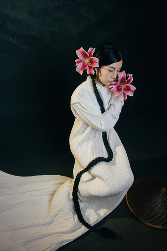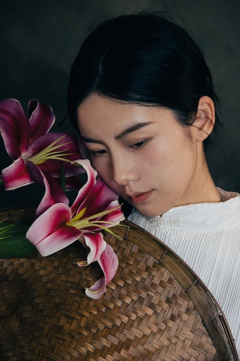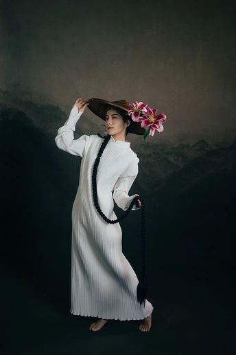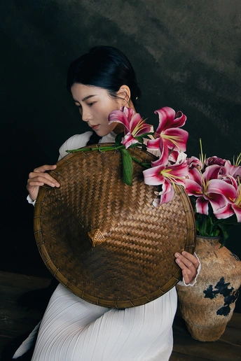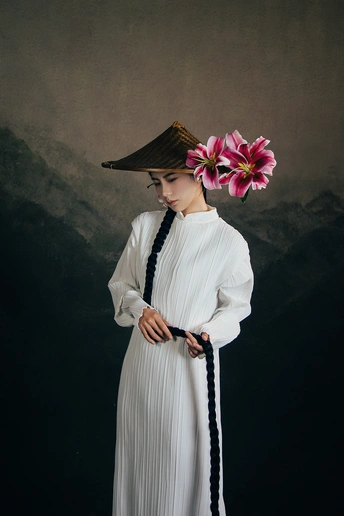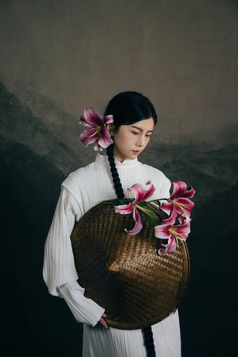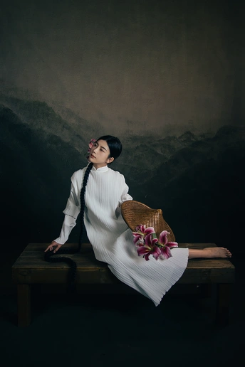 一袭白衣,如月光落尘。 长辫垂落,挽着时光的褶皱。 斗笠轻抱,藏着山野的风。 百合在发间、在臂弯,开成一瓣瓣温柔的心事。 人在画中,也在诗里。 出镜:小雯 带拍:阿林几