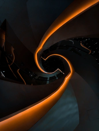 橙光如带,在深黑的旋梯上蜿蜒成涡。每一步都像是踏入时间的褶皱,被这流动的光带牵引着,向中心无限收束。冷与暖的碰撞,曲与直的对话,让这座城市的心跳,在光影的漩涡里,清晰可闻。