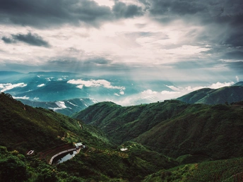 夏日里,梯田已经种上了水稻、茶树或者果树,一片生意盎然。阳光透过厚厚的云层,把不同绿色的植被和远处的光伏板照亮。