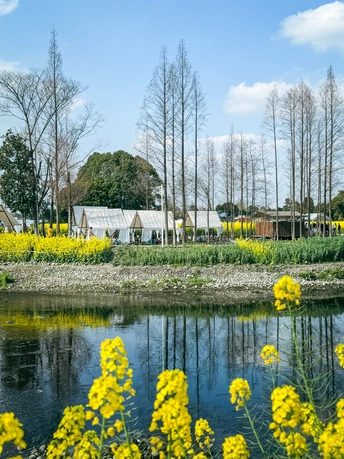 这幅作品在构图上采用前景引导与纵深延展相结合的手法,近景油菜花形成自然画框,中景水域倒影构建虚实对话,远景水杉林与帐篷群构成视觉焦点,三重空间层次通过河岸的水平线条自然过渡。垂直的水杉树干与水平的帐篷轮廓形成几何对比,游人点缀其间打破对称,增添画面呼吸感。色彩处理极具张力,明黄油菜花与湛蓝天空形成高饱和撞色,白色帐篷作为中性色缓冲视觉冲击,水杉深褐与水面墨绿构成沉稳基底,倒影将色彩进行二次晕染,形成上下呼应的色彩交响。 情感表达上,作品成功营造出春日特有的松弛感:盛开的油菜花传递蓬勃生机,静谧水面映照出悠然心境,帐篷与游人的存在赋予画面人间烟火气。观者能从中感受到都市人对田园生活的向往,以及自然与人文交融的温暖情愫。主题层面,作品巧妙探讨了传统田园与现代休闲的共生关系——金黄花田代表着农耕文明的诗意,而白色帐篷则象征着都市人对自然的短暂回归,这种碰撞既保留了乡土本真,又注入了当代生活美学。 艺术价值体现在三个维度:其一,将日常景致升华为具有哲学意味的视觉文本,倒影的运用不仅拓展空间维度,更隐喻着现实与理想的镜像关系;其二,通过色彩心理学调动观者情绪,明黄的愉悦感与蓝色的宁静感形成情冲突