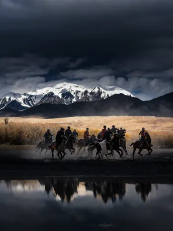 慕士塔格峰的雪冠刺破浓云,在帕米尔高原的天幕下矗立成永恒的丰碑。赭黄色的戈壁滩上,一场属于塔吉克族的叼羊盛会,正以最炽热的姿态,撞碎雪山的清冷。 马蹄踏破尘烟,数十匹骏马裹挟着劲风奔腾向前,铁蹄叩击大地的轰鸣,与骑手们的呐喊交织,在旷野上激荡出最雄浑的乐章。人群中那抹红衣格外耀眼,像一团燃烧的火,在黑白灰的天地间划出滚烫的轨迹。塔吉克族的汉子们俯身探臂,肌肉紧绷的线条里,藏着高原儿女与生俱来的力量,每一次争夺、每一回腾挪,都是勇气与默契的极致碰撞。 被称作“高原雄鹰”的塔吉克人,将叼羊刻进民族的血脉。这不是简单的竞技,是代代相传的信仰,是马背上的生存智慧,更是面对苍茫天地时,永不屈服的生命宣言。慕士塔格峰沉默注视,千年的冰雪见证着这份豪情,风卷着尘烟,也卷着这个民族的热血,在帕米尔的土地上生生不息。 当骏马踏过戈壁,当呐喊响彻云霄,冰峰与旷野之间,人与马融为一体,豪情与天地共生。这瞬间的奔涌,是帕米尔高原最动人的脉搏,是塔吉克族用热血书写的,属于高原的不朽传奇。