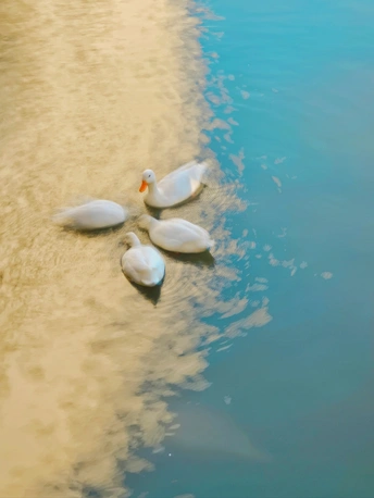 四只白鸭聚在一起就像一朵花,一只鸭子的红色喙如同花朵的花蕊,在冷暖交界处开放。