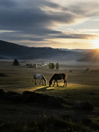 夕阳落笔时偏爱侧锋——它把两匹马的身影拉成修长的草书,每一笔都蘸饱了金黄。棕与白此刻都褪去名字,融化成暖色调里深浅不一的墨迹。它们低头啃食的或许不是青草,而是从土壤里长出来的、毛茸茸的时光。 远山用黛青色的沉默镇守地平线。那抹游移在山腰的薄雾,多像未说完的话,被风轻轻含住,又不忍吐露。几座矮屋趴在草浪间,屋顶升起淡蓝色的炊烟,细得仿佛光阴断裂处的丝线——有人在世间生火,有人在暮色里续写人间。 云层是天空未装订完的书册。夕照为它们烫上鎏金书口,最厚的那本正在西天缓缓合拢。光从合页处溢出,淌过马背,漫过草尖,在白马抬头的瞬间凝固成睫毛上的星火。 这是白昼向夜晚交割的仪式。马匹不知自己是仪式中心——棕马蹭了蹭同伴的肩膀,这个简单的动作让整片草原的重量轻轻摇晃。它们脚下,自己的影子越拉越长,终于在某处交融成完整的灰。此刻万物都是序言。山峦是起伏的句读,炊烟是未干的墨迹,马背曲线是自然写下的最温顺的比喻。而你我途经此地,不过是偶然跌进某个黄昏的逗号,在光与影换位的间隙,听见了永恒匀速的呼吸——它不催促任何事物,只是让该下沉的下沉,该亮起的亮起,让两匹吃草的马成为整片草原安详的轴心。