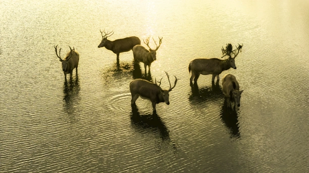 暖金色的夕晖漫过滩涂,六只麋鹿静立浅水中,身影与波光交叠。它们或低头饮水,或侧耳聆听,在温柔的光影里,勾勒出自然最静谧的诗意。这是荒野与生灵的温柔相遇,也是时光停驻的瞬间。