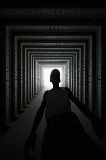 层层叠叠的楼层延伸向上,将视线引向隧道尽头的光亮。逆光的身影张开双臂,在明暗交界的通道里,向着希望奔赴。这是一场关于勇气的前行,每一步都在靠近光,靠近新生的力量。