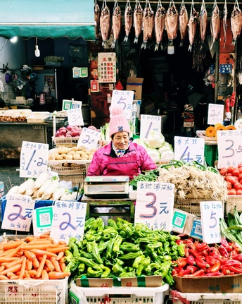色彩鲜亮的蔬果堆成小山,手写的价格牌错落其间,摊主的笑脸藏着生活的温度。挂起的鱼干、翠绿的青椒、橙红的胡萝卜,在喧闹的菜市中,勾勒出最鲜活的人间烟火,每一缕气息都是平凡日子里的温暖诗意。