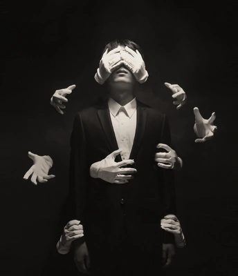 黑白光影里,无数白手从暗处伸出,有的捂住双眼,有的攀附身躯,将人困在无形的束缚中。这是一场关于精神与现实的隐喻,在沉默的画面里,诉说着被外界裹挟、失去自我的困境,每一只手都藏着无法挣脱的压力与迷茫。
