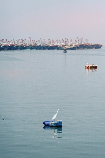 港口是时间的容器, 装着渔民的汗水, 也装着飞鸟的自由。 渔船归航, 把风浪与收获都藏进船身的斑驳里; 白鹭停驻, 在人造的浮标上, 划出一道自然与人文的交界线。 我们总在追逐远方, 却忘了最动人的纪实, 是这方寸之间: 有人以海为田, 有鸟以港为家, 在同一片粉蓝的天光下, 各自守着生命的节奏。