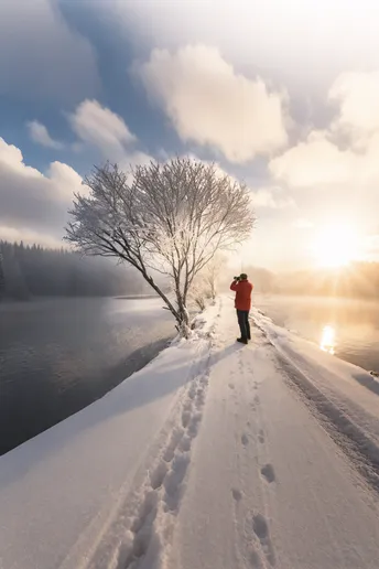 在伊犁河谷的深处,当严冬用最温柔的笔触抚摸大地,天鹅泉便醒来,成为一座悬浮于时间之外的琉璃梦境。晨光尚未锋利,只是惺忪地漫过远山,将蓄了一夜的乳白色水汽轻轻拨开。于是,整个泉湾苏醒了——不是喧闹的,而是带着一种呵气如兰的静谧。 他着一身红衣,立于皑皑雪径的中央,像一柄静默的朱砂尺,丈量着天地间的纯净,相机是他延伸的感官,朝向那片被雾凇点化的魔法森林。每一棵树都成了冰晶的雕塑,枝条裹着茸茸的“雪糖”,在淡金色的曦光中,玲珑剔透,仿佛轻轻一触,便会叮咚作响。这不是寒冷的肃杀,而是水汽与低温共舞的奇迹,是树在冬日里开出的、最短暂也最璀璨的花。 泉水并未封冻,氤氲着绵绵不绝的地热暖意,水面如一块未被擦拭的毛玻璃,朦胧地倒映着天上的云影与岸边的琼枝。光,成了最高明的画家。它掠过冰晶,折射出细碎的星芒;它漫过水面,铺就一条粼粼的、通往梦境深处的碎金之路;它最后温柔地停驻在那袭红衣上,让那抹红不再突兀,反而成了这无边素缟中,一个温暖而必要的注解。远处,几只天鹅的优雅身影或许正隐于轻纱之后,但此刻,天地的主角是寂静本身。他按下快门的每一次“咔嚓”,都是对这场盛大寂静的一次虔诚采样。