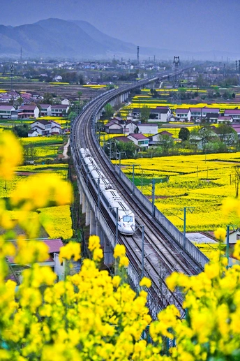 为了拍这张,蹲了俩小时油菜地,鞋上全是泥。看到列车钻花海的瞬间,觉得泥都值了——春天和时代,真的能在镜头里撞得这么好看。