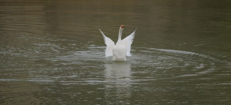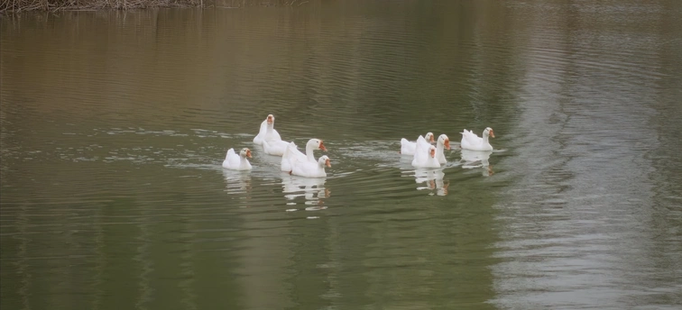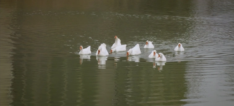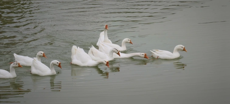微漾的暗绿水波上,几株芦苇临风摇曳,疏影横斜。一群白鹅结伴而来,雪白的羽衣浮于清池,红喙红掌相映成趣。它们悠然划水,脖颈弯成优美的弧线,红掌轻拨清波,荡开一圈圈细碎涟漪。偶有微风拂过,水面倒影轻颤,白鹅们或行或停,自在从容,为静谧的水乡添了几分生机与野趣。