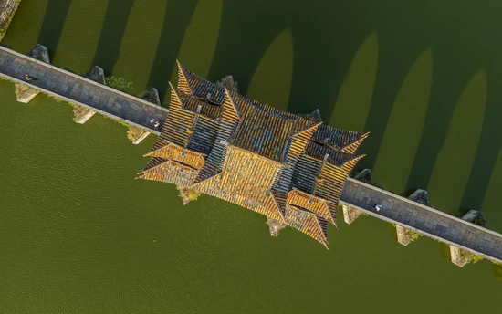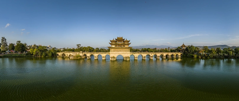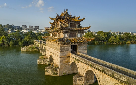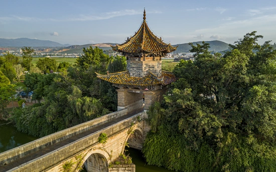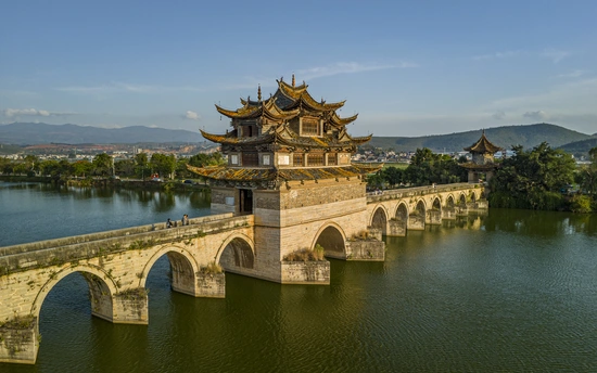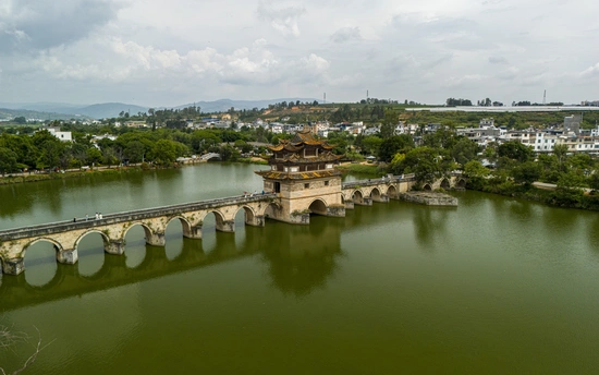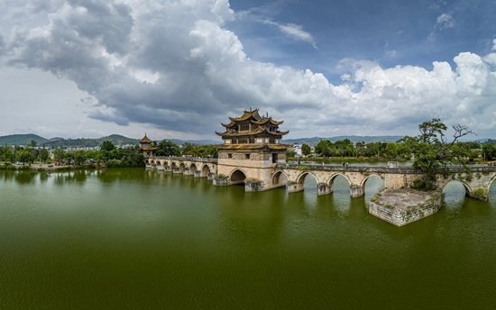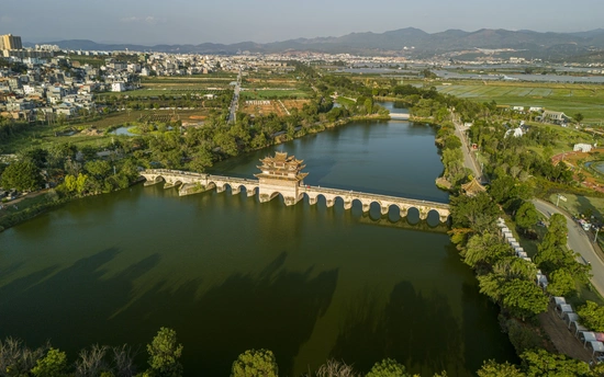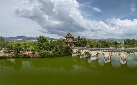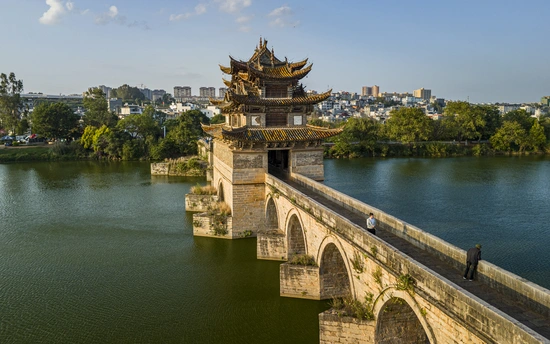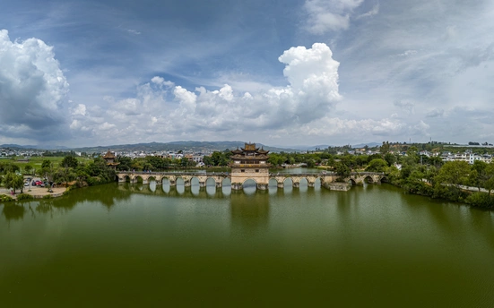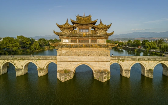 在云南红河建水的碧水之上,静静卧着一座古老的石桥,它像一位阅尽沧桑的智者,用十七个拱形的孔洞,轻轻拨动着时光的琴弦。 阳光洒落,桥身在清澈的河水中投下斑驳的倒影,那层层叠叠的飞檐翘角,在蓝天的映衬下显得格外庄重而优雅。桥中央那座巍峨的阁楼,仿佛是历史的守望者,默默注视着脚下流淌的河水,也注视着来来往往的行人。 微风拂过,水面泛起层层涟漪,桥影随之轻轻摇曳,仿佛在诉说着那些古老的故事。远处的青山如黛,近处的绿树成荫,一切都显得那么宁静而美好。站在这里,仿佛能听到历史的回声,感受到岁月的温柔。 十七孔桥,不仅是一座连接两岸的通道,更是一座连接过去与未来的桥梁。它见证了建水的繁华与变迁,也承载着人们对美好生活的向往。在这里,时间仿佛变得缓慢,让人忘却尘世的喧嚣,只想静静地欣赏这份难得的宁静与美丽。