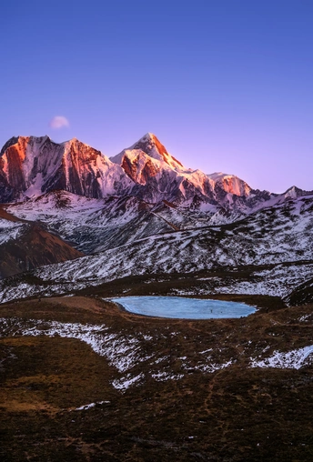 贡嘎雪山粉调时刻 本作品拍摄于中国川西木雅措垭口,远处巍峨的贡嘎雪山在日出时分被第一缕阳光点亮,雪峰由冷冽转为温暖,仿佛在静默中诉说着时间的流动。山脚下,一汪高山湖泊如明镜般嵌入大地,映照着天地之间的宁静与辽阔。 这不仅是一处自然景观,更是我心中最深处的“家园意象”。这样的山川成为我精神上的坐标。贡嘎的高度与沉稳,让我在纷繁世界中重新找到内心的秩序与方向。