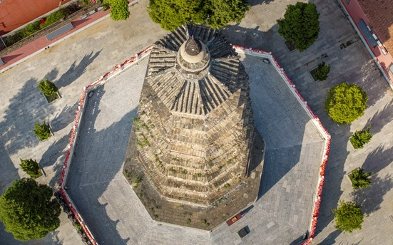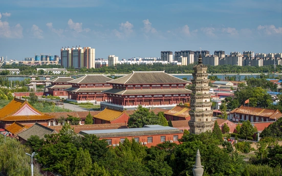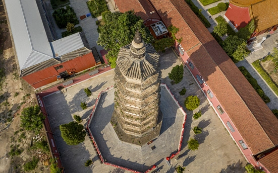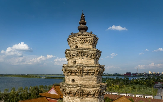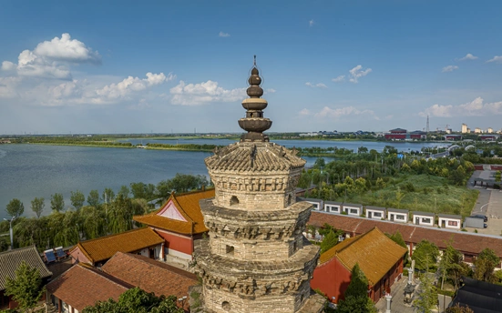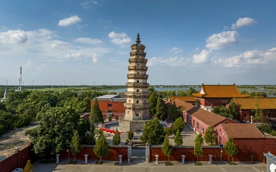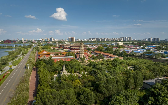 晴空如洗,云絮轻盈飘过天际,普彤塔静立于南宫大地,如一位阅尽沧桑的智者,在绿树红墙间安然呼吸。塔身层层叠叠,砖石斑驳却风骨犹存,每一层檐角都似在诉说千年的梵音。塔基围以朱红祈福带,随风轻舞,是信众无声的祈愿,也是岁月温柔的注脚。红墙黄瓦的殿宇环伺左右,飞檐翘角如鸟翼欲飞,与塔影相映成趣。院前石灯列队,青松挺立,仿佛守护着这片净土的静谧。远处河水如镜,倒映蓝天白云,与近处古塔相望,构成一幅天人合一的画卷。微风拂过树梢,鸟鸣清越,时光在此处悄然放缓,让人忘却尘嚣,只余心安。这里不只是历史的遗存,更是心灵的归处——在普彤塔下,时间慢了,心却满了。