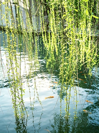 垂落的柳丝是春天的帘幕,澄澈的池水是自然的画布,游弋的金鳞是灵动的笔触。风拂柳摇,鱼戏波间,每一缕柳丝都带着春的温柔,每一条游鱼都藏着夏的鲜活,在这方小池里,把日子过成了诗。