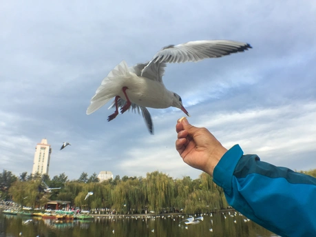 红嘴鸥舒展双翼,从天际俯冲而下,精准衔起掌心的食物,翅膀带起的风,是天空的问候。湖畔的垂柳、远处的楼宇,见证着这场人与生灵的温柔对话,诠释着人与自然和谐共生的最美瞬间。
