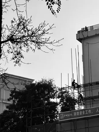 工地上,建筑工人正坐在脚手架上休息