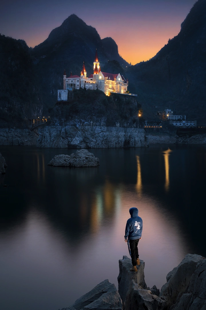 寻一座山,等一场暮。 当日光燃尽,星辰未醒, 这山水间便亮起了一盏, 只属于童话的灯。 而我站在这里, 像闯入了某个被世界遗忘的章节。