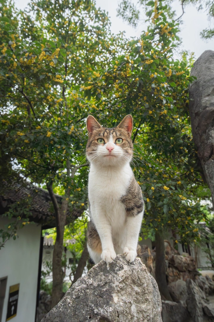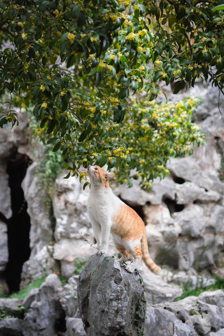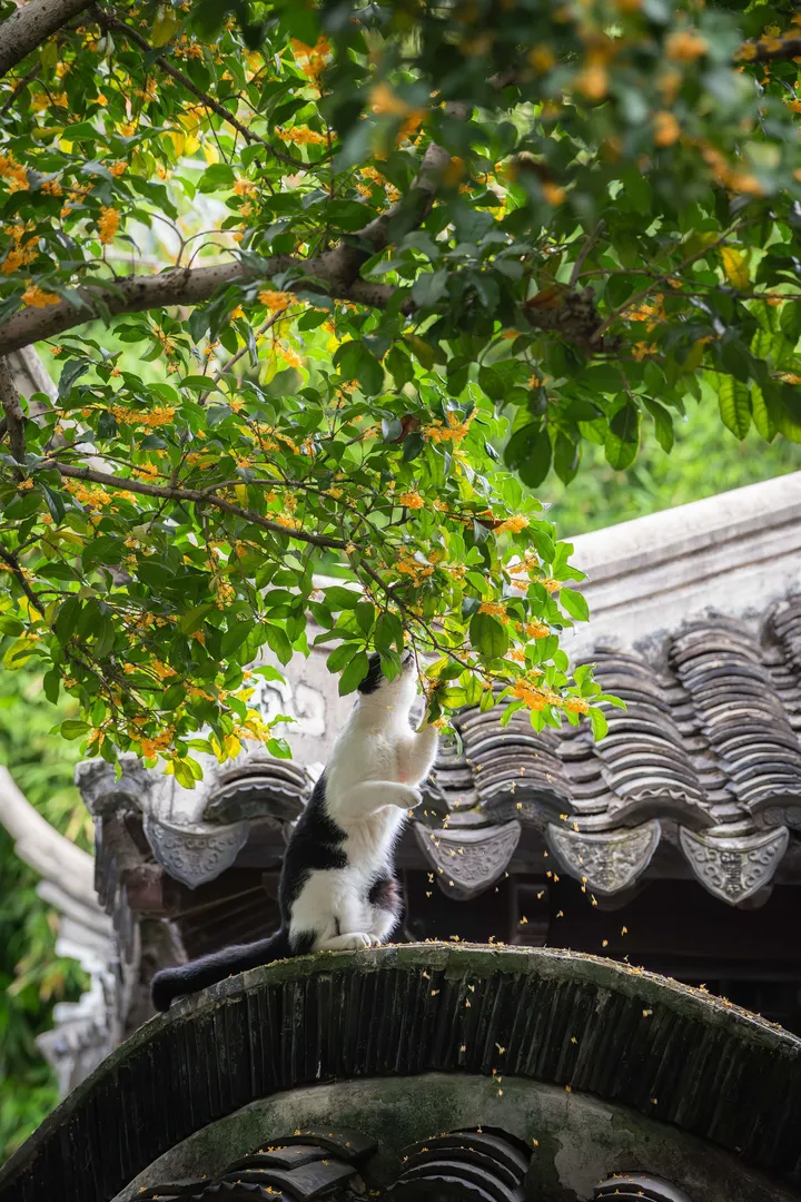 想去拍和猫嗅桂花,没想到小猫下了一场桂花雨给我看