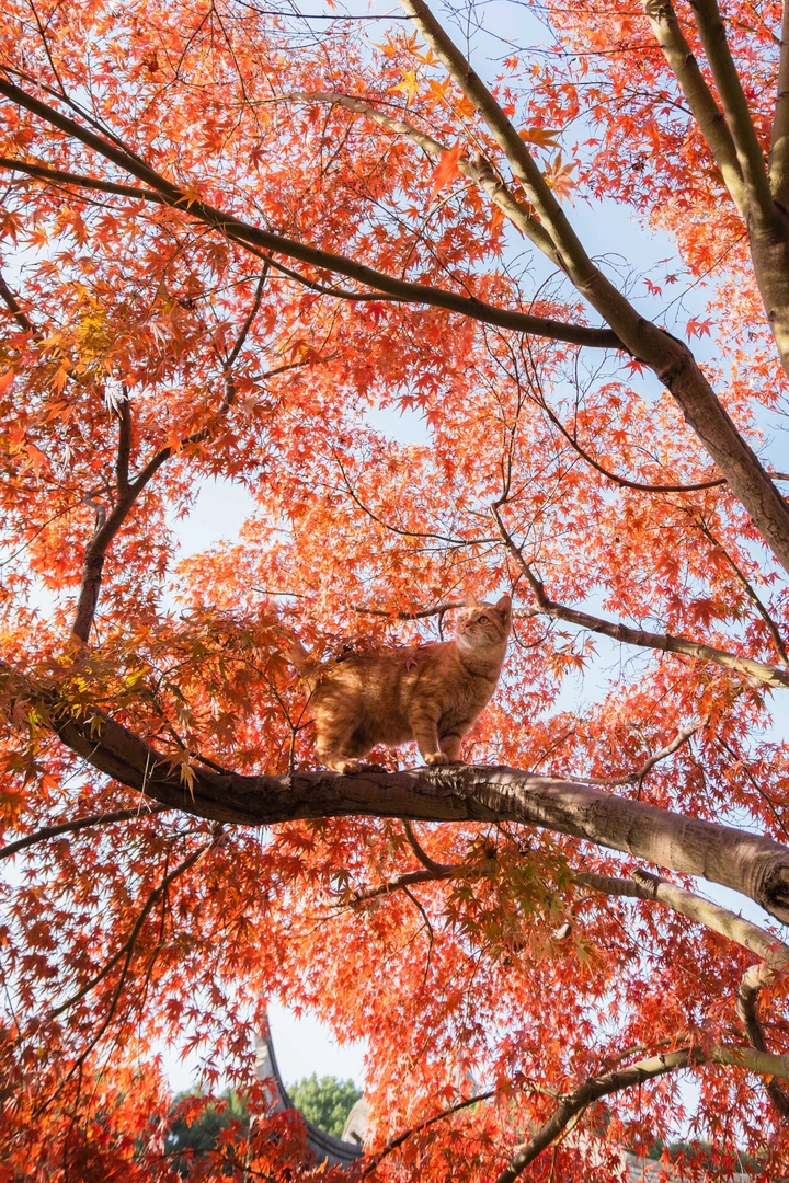 这棵枫叶对小猫很友好,形状和高度适合攀爬。秋天的最美颜色之一。