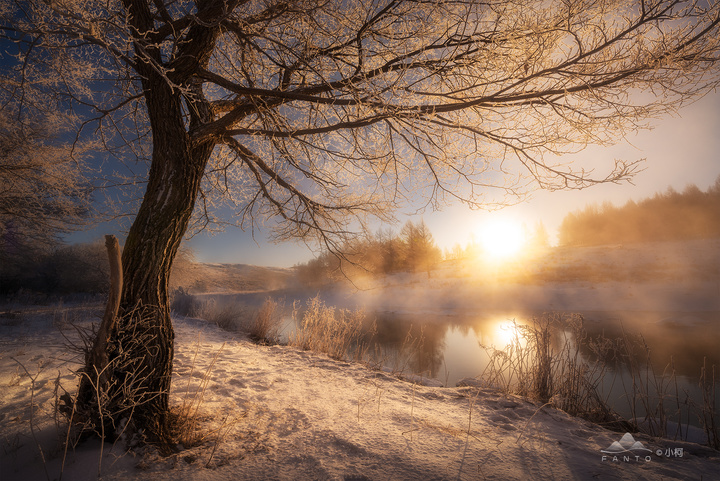 将近-40℃的阿尔山 清晨的阳光照在不冻河 在雾气的映衬下犹如仙境