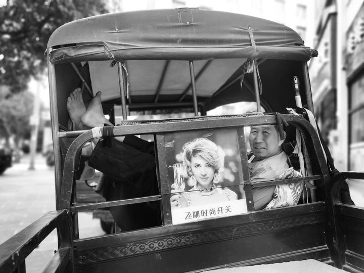 1张黑白光影里,三轮车是他的一方小天地。赤脚轻搭,任时光慢淌;广告画旁,是生活与时尚的奇妙碰撞。市井一隅,藏着属于他的从容与鲜活。