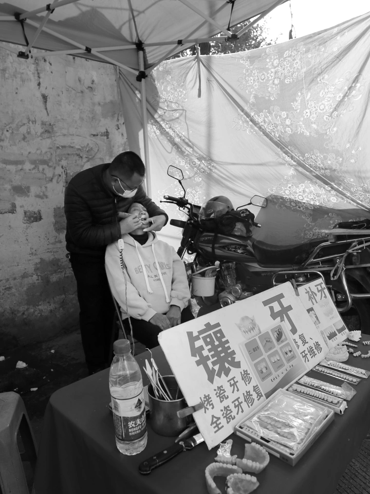 1张简陋的帐篷支起一方“诊室”,工具摊在桌案,摩托车倚着布幔。口罩后的手细致摆弄,街头的镶牙摊,是烟火里的修补,也是普通人将就里的生活体面。