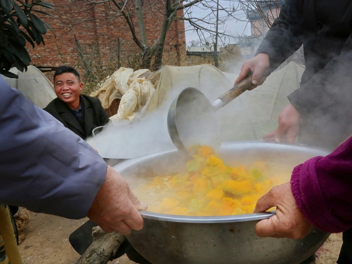 1张砖墙角的枯枝还带着凉,大铁锅里的甜香早漫开了。糙手攥着锅沿,木勺舀起半瓢软绵的南瓜块,白雾裹着笑闹往衣领里钻——这口热乎,是乡里乡亲攒在烟火里的暖。