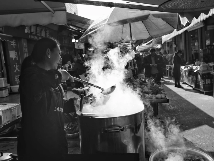 1张巷弄里的烟火,是最鲜活的生活注脚。大锅蒸腾的白雾裹着热乎气,摊主手腕一扬,勺起勺落间,把寻常日子熬成了暖香四溢的滋味。周遭的吆喝、往来的脚步,都浸在这烟火里,成了人间最踏实的热闹。