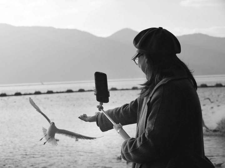 1张风裹着湖的气息扑在袖口,伸开的掌心是给海鸥的邀约。手机镜头追着振翅的弧线,把此刻的温柔,框成黑白里的生动。