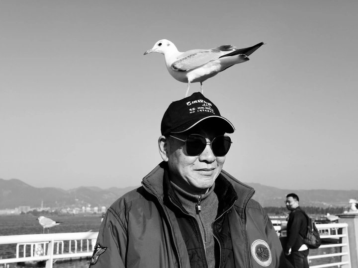 黑白滤镜褪去了色彩的喧嚣,让镜头里的每一个瞬间都沉淀成纯粹的诗意。老人头顶落定的红嘴鸥,是自然与人最亲昵的互动;少女掌心前振翅的飞鸟,是信任与好奇的双向奔赴;群鸟掠过湖面的剪影、独自伫立、与人擦肩而过的生灵,都在简洁的明暗里,诉说着春城湖畔独有的浪漫。这些定格的画面,是风的形状,是鸟的轨迹,更是人与自然和谐共生的温柔瞬间。