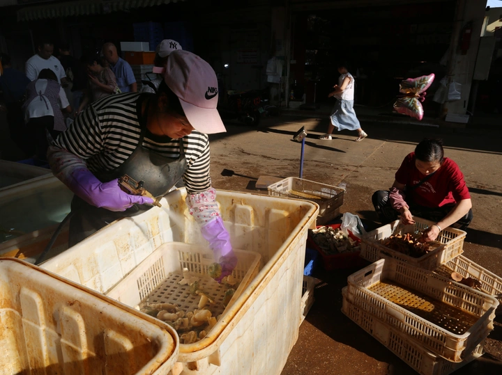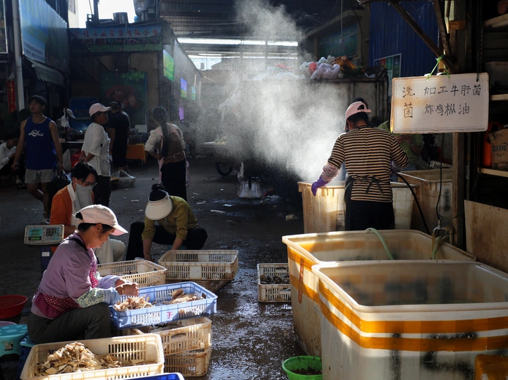 晨光里的菌子市集。清晨的阳光斜斜切开市集的明暗,一位摊主正专注地清洗刚采收的野生菌。紫色的防水手套在冒着水汽的塑料箱里翻拣,旁边的伙伴也低头忙碌着分拣。地面堆叠的塑料筐,在诉说着这份山野馈赠来之不易,这是属于市集最鲜活的日常。
