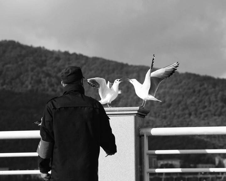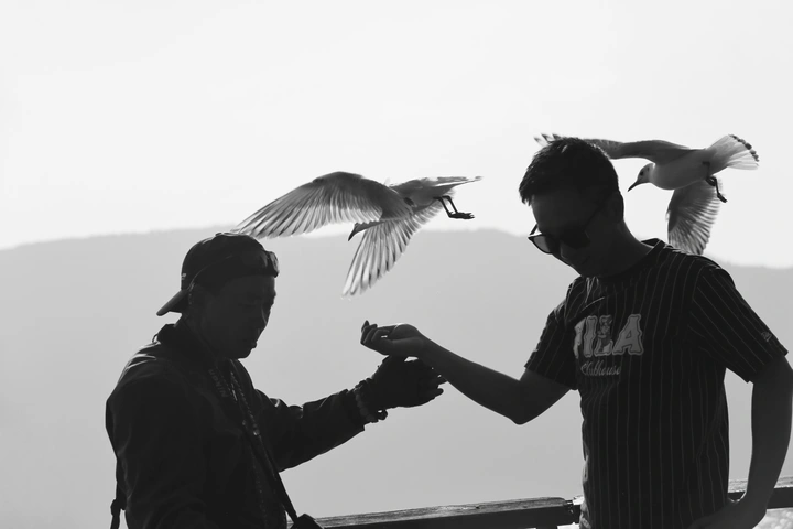 黑白滤镜将喧嚣滤去,只余纯粹的光影与互动。两人的身影在远山与天光间勾勒出温柔轮廓,红嘴鸥振翅而来,翅膀扇动的风仿佛触手可及。掌心的邀约,是人与生灵最默契的对话,这一刻,山海无声,唯有生命的灵动在黑白之间肆意流淌,定格成治愈人心的瞬间。